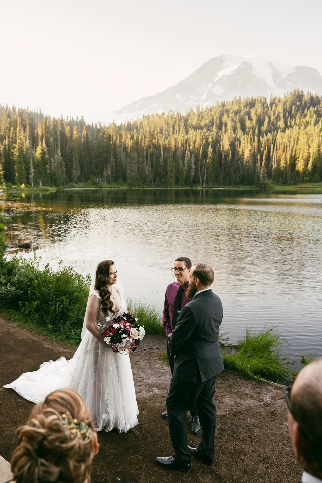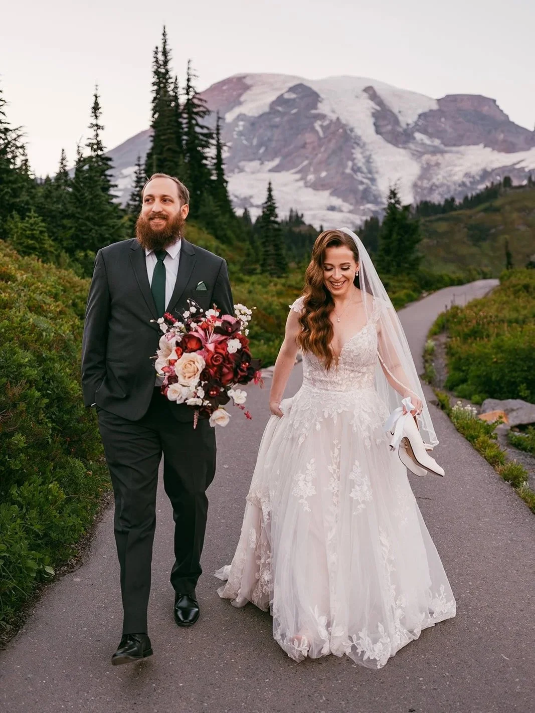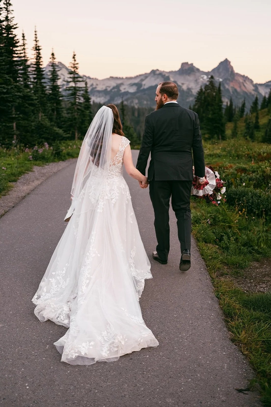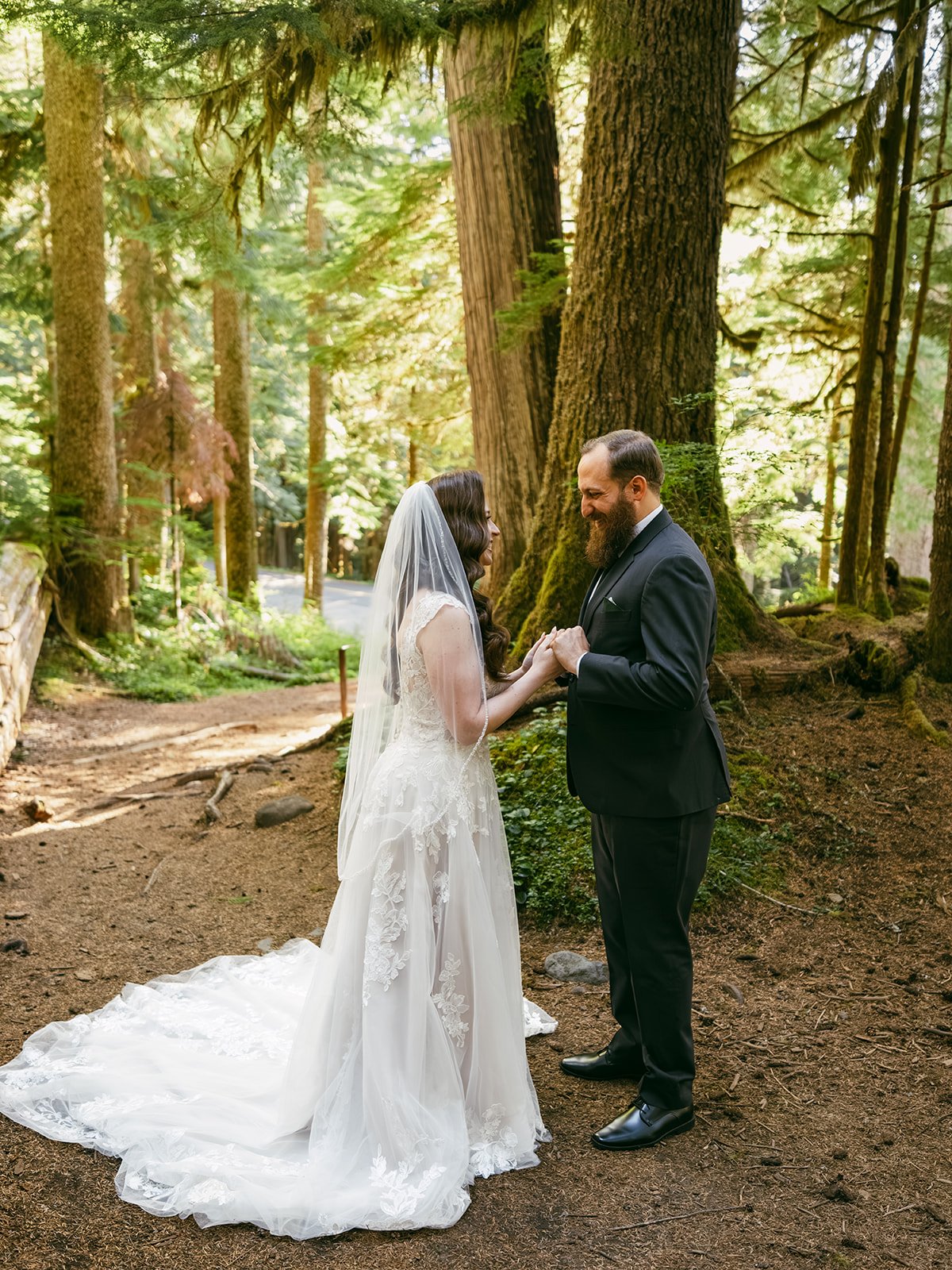 Keep scrolling for images from this beautiful day—from starting at an Airbnb in Ashford, WA, to a first look in the forest, to a ceremony at Reflection Lakes, and finally a sunset hike along the Skyline Trail to Myrtle Falls.