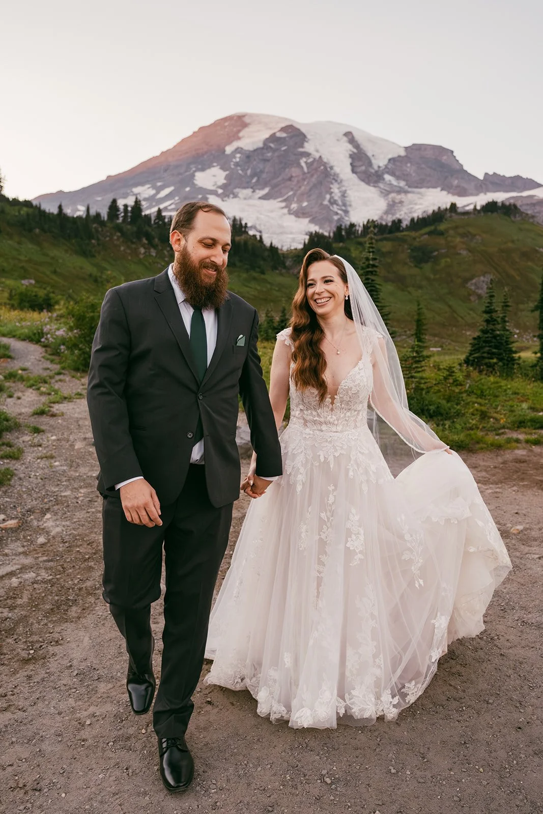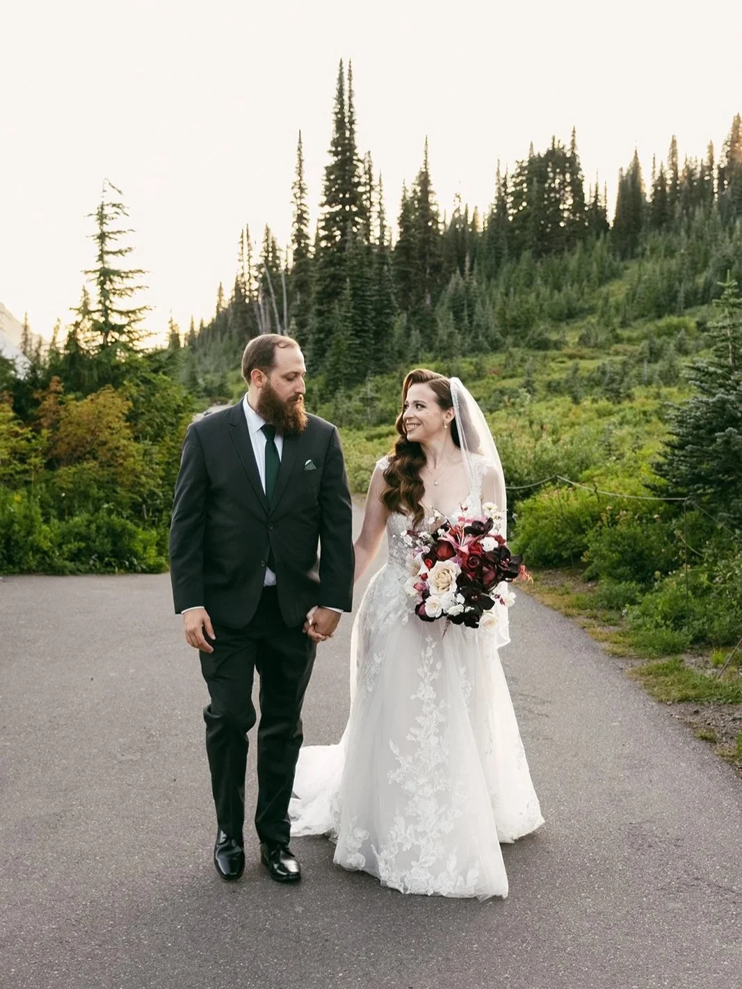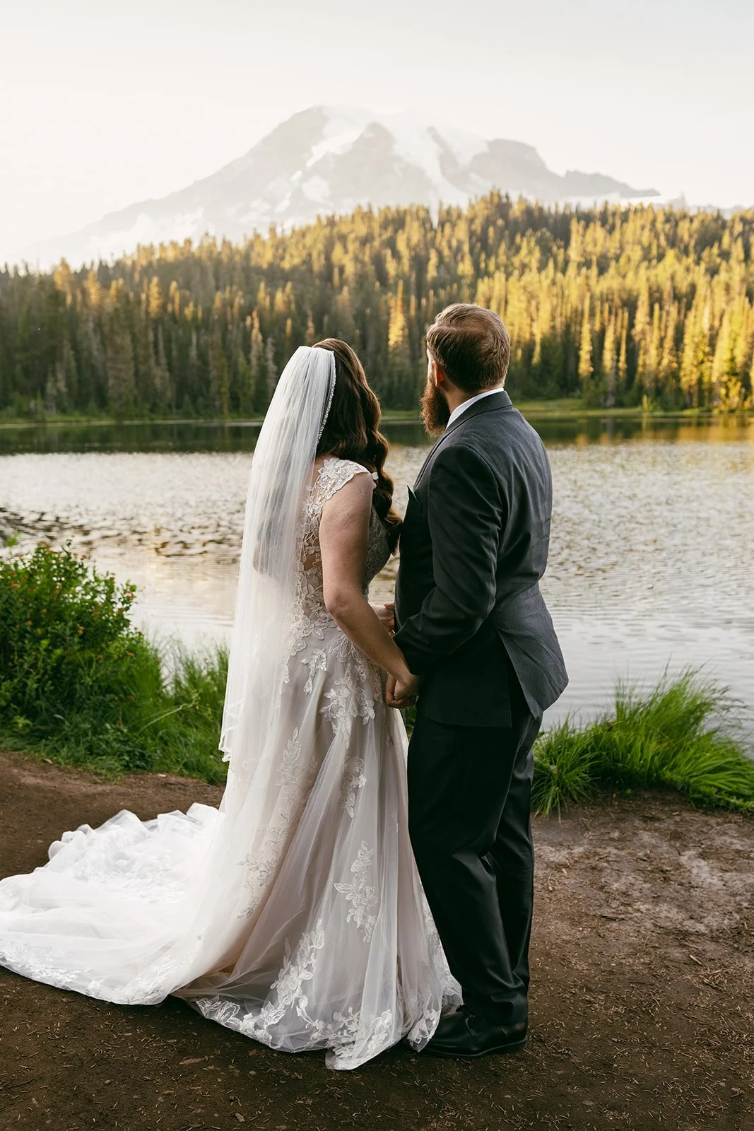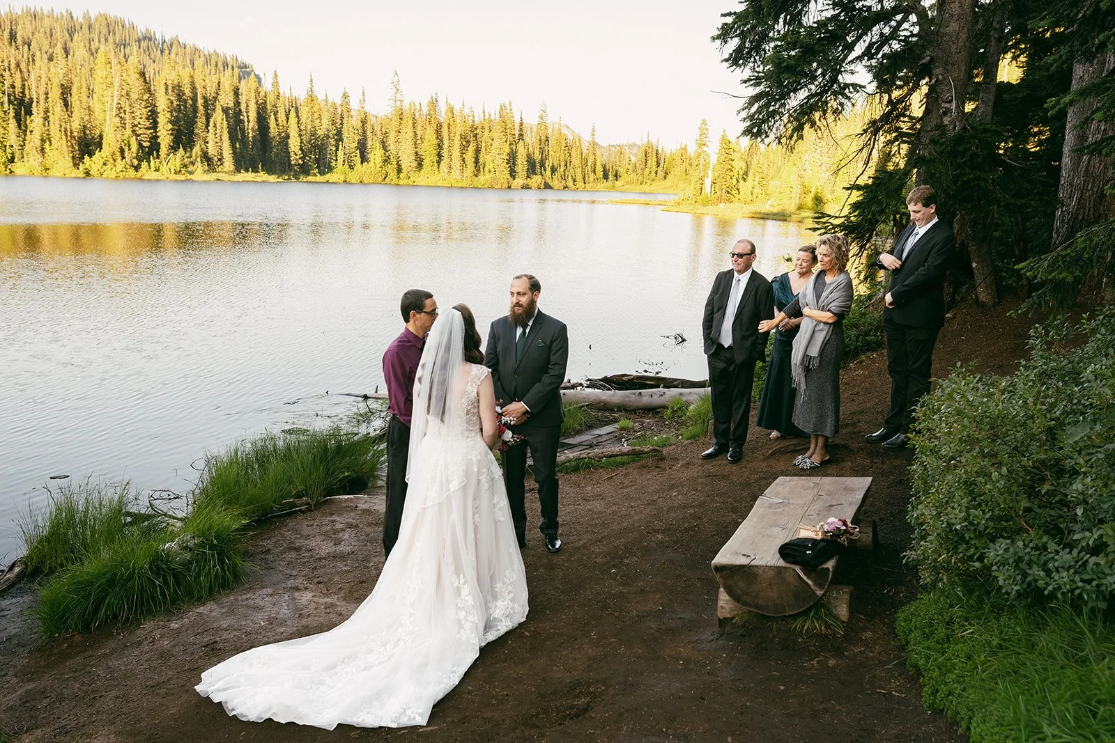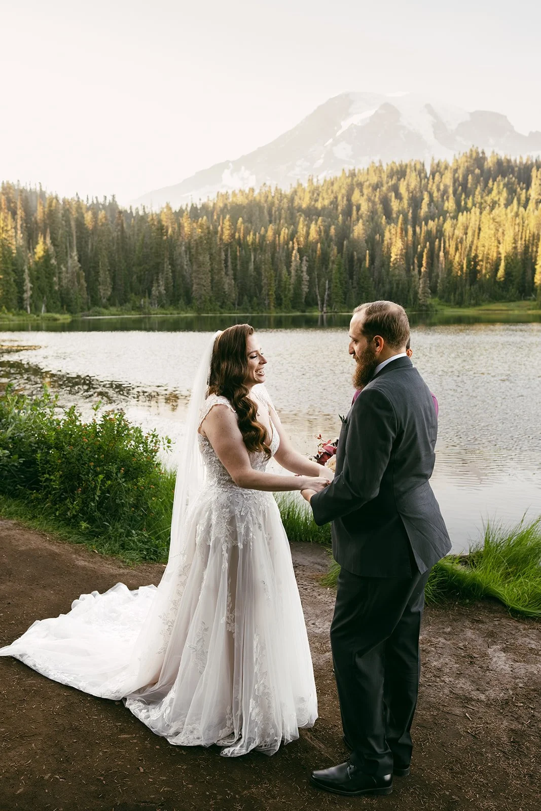 Keep scrolling for images from this beautiful day—from starting at an Airbnb in Ashford, WA, to a first look in the forest, to a ceremony at Reflection Lakes, and finally a sunset hike along the Skyline Trail to Myrtle Falls.