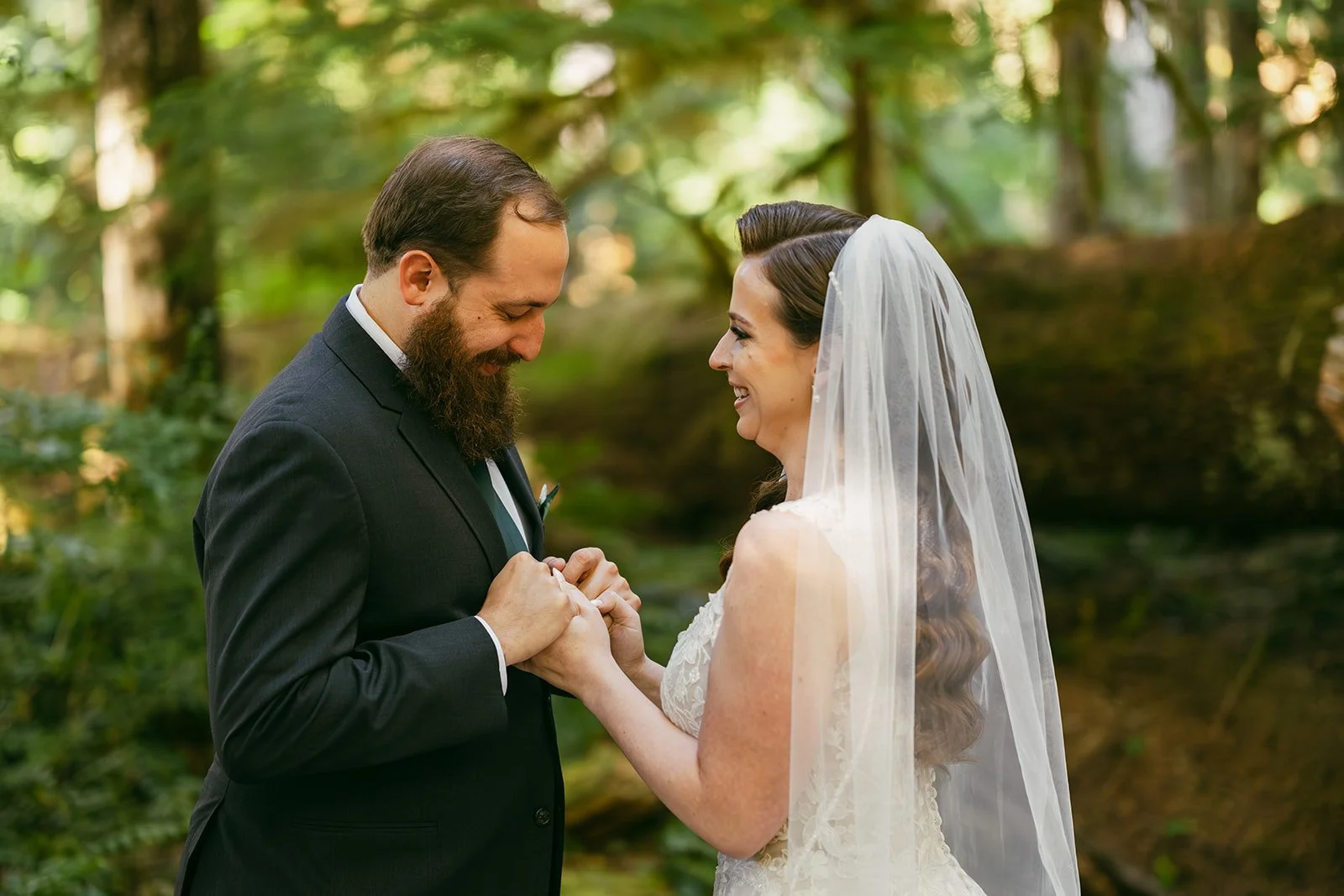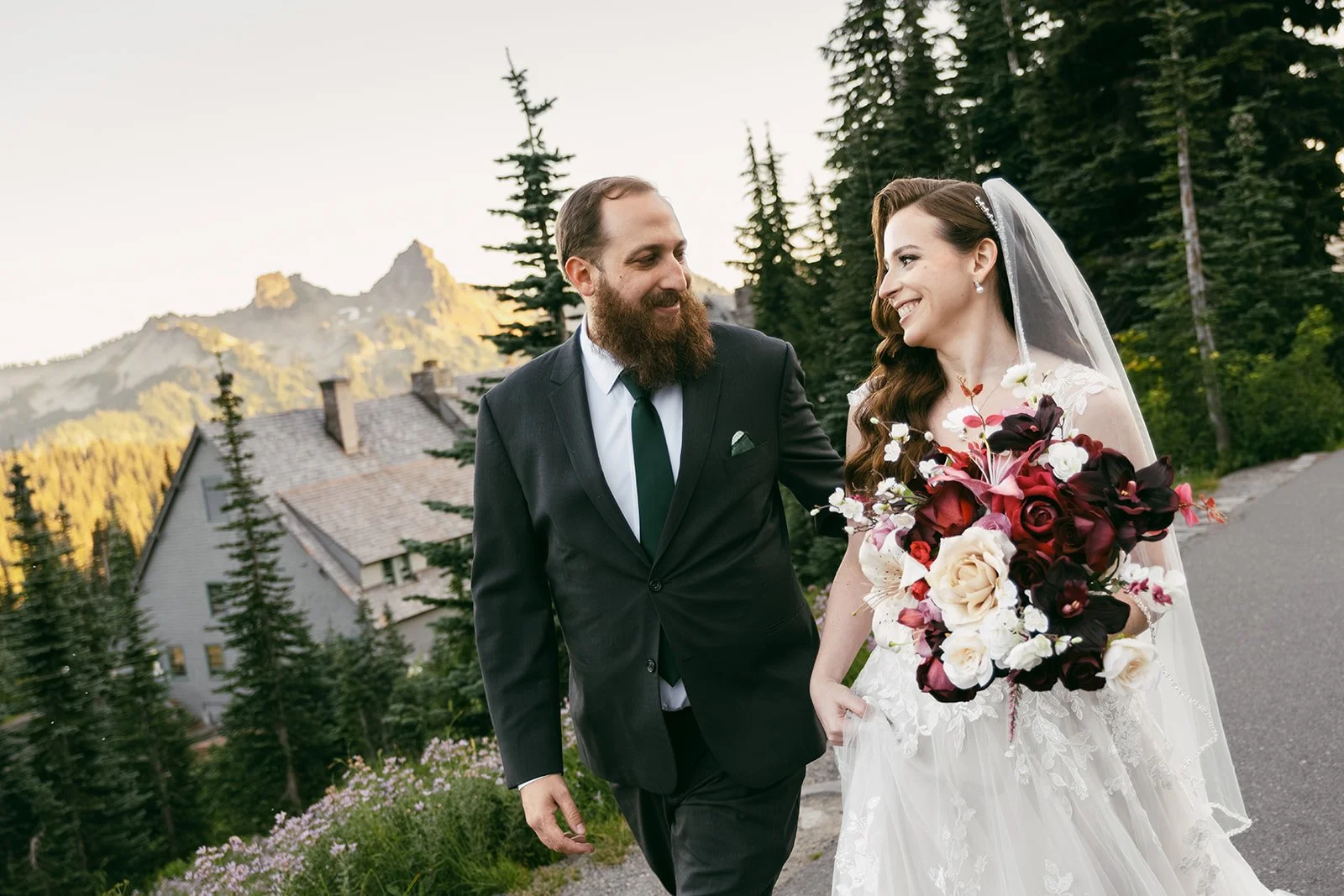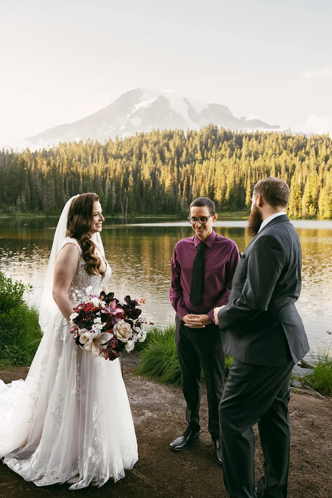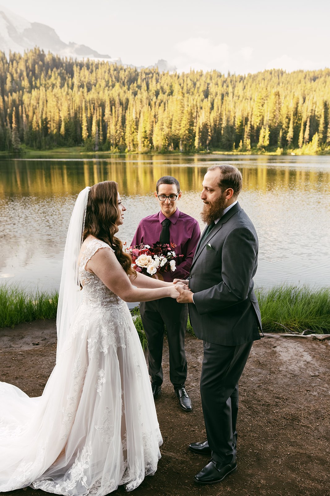 Keep scrolling for images from this beautiful day—from starting at an Airbnb in Ashford, WA, to a first look in the forest, to a ceremony at Reflection Lakes, and finally a sunset hike along the Skyline Trail to Myrtle Falls.