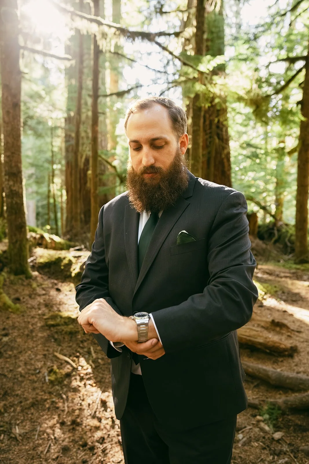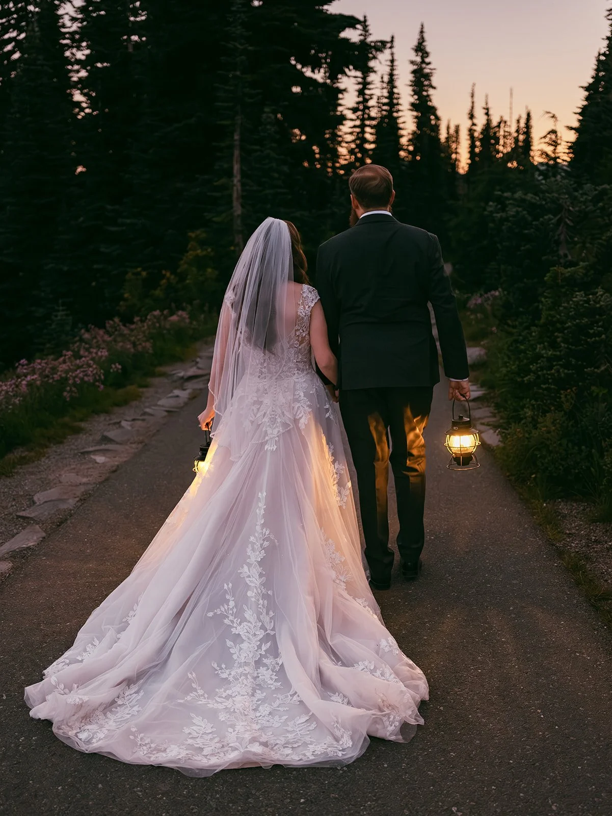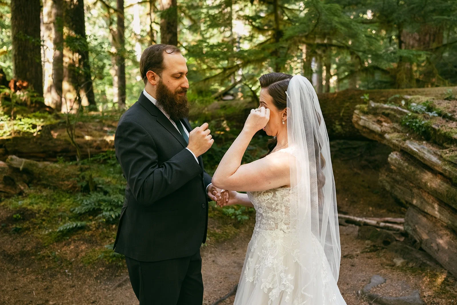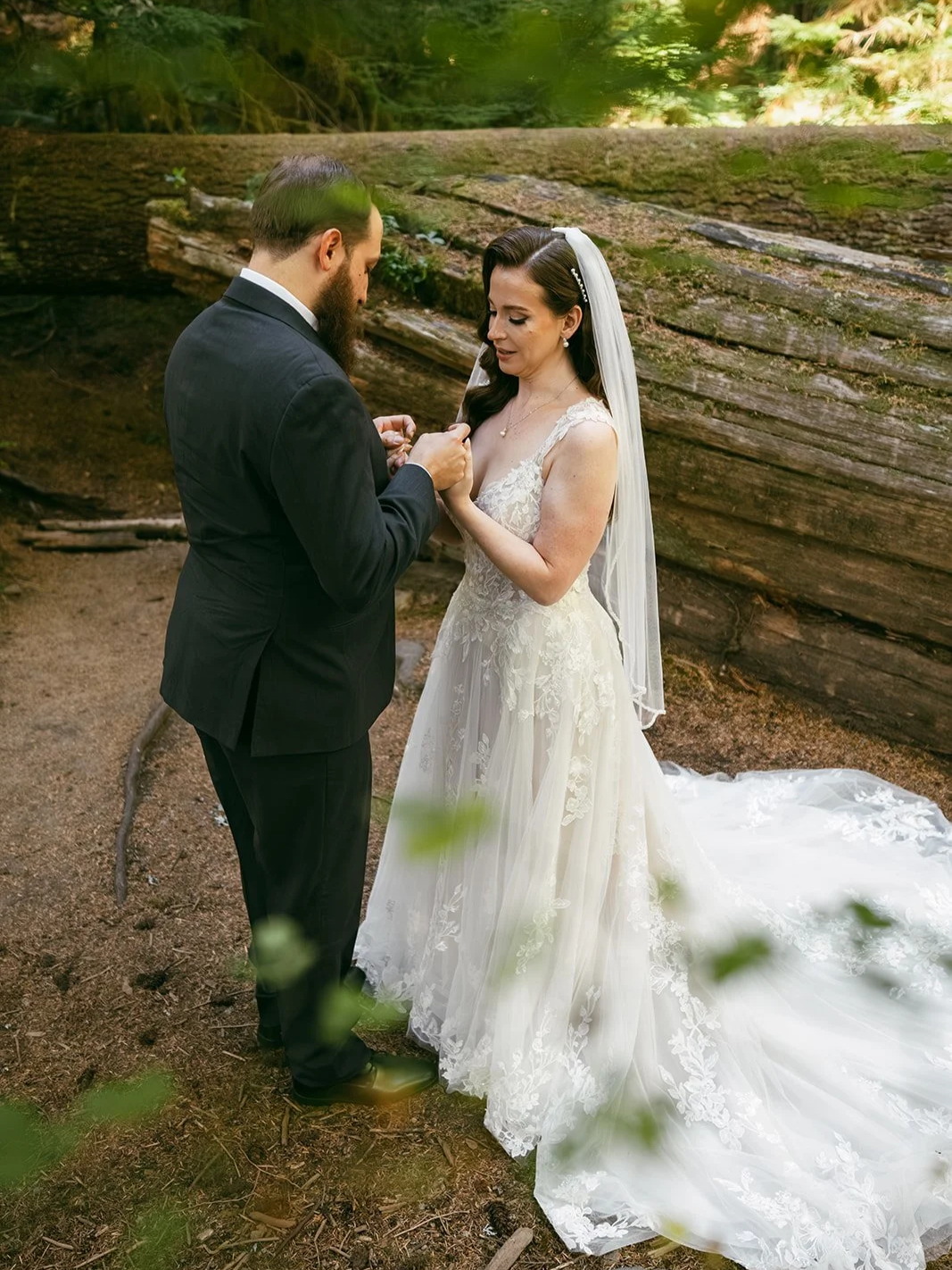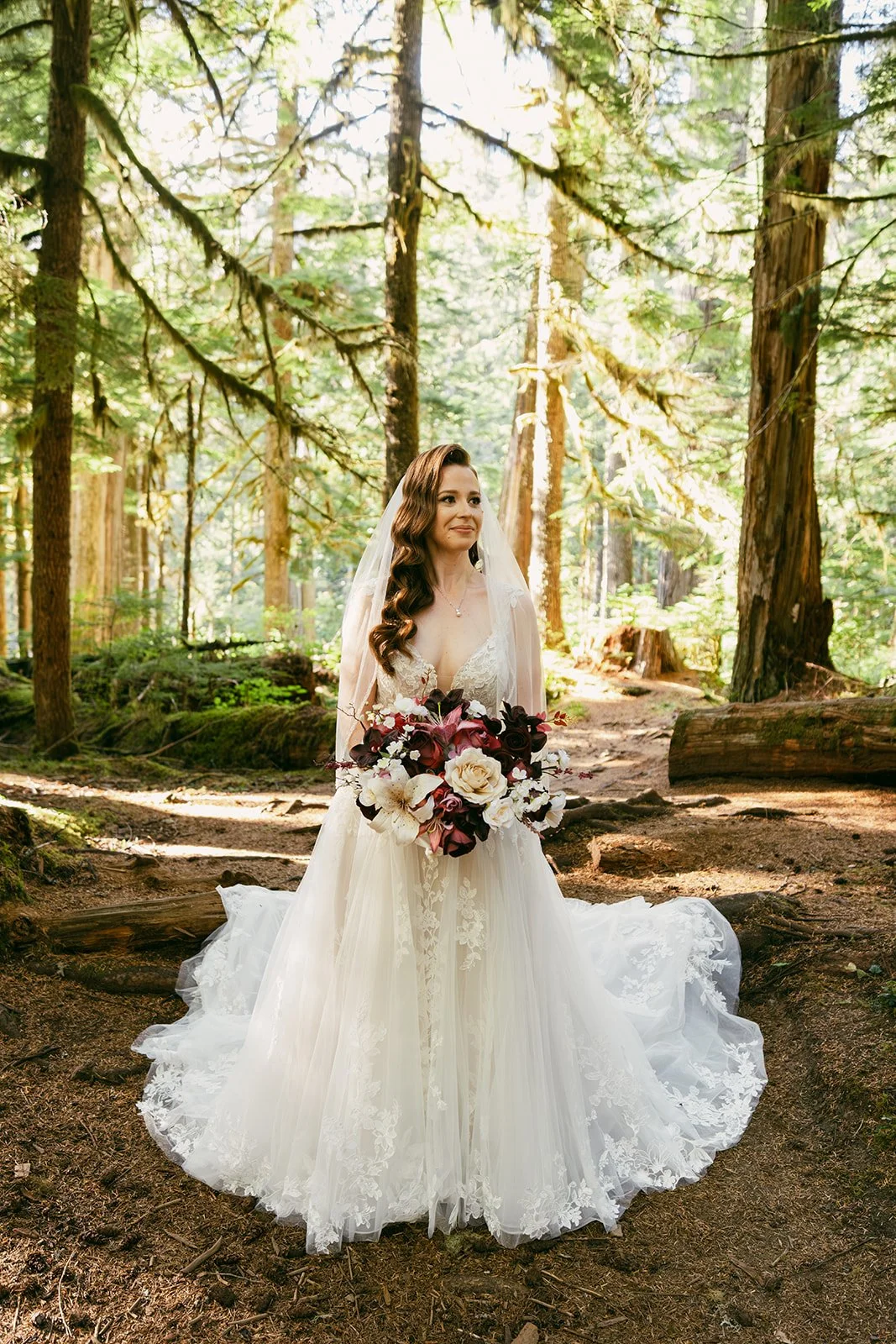Keep scrolling for images from this beautiful day—from starting at an Airbnb in Ashford, WA, to a first look in the forest, to a ceremony at Reflection Lakes, and finally a sunset hike along the Skyline Trail to Myrtle Falls.