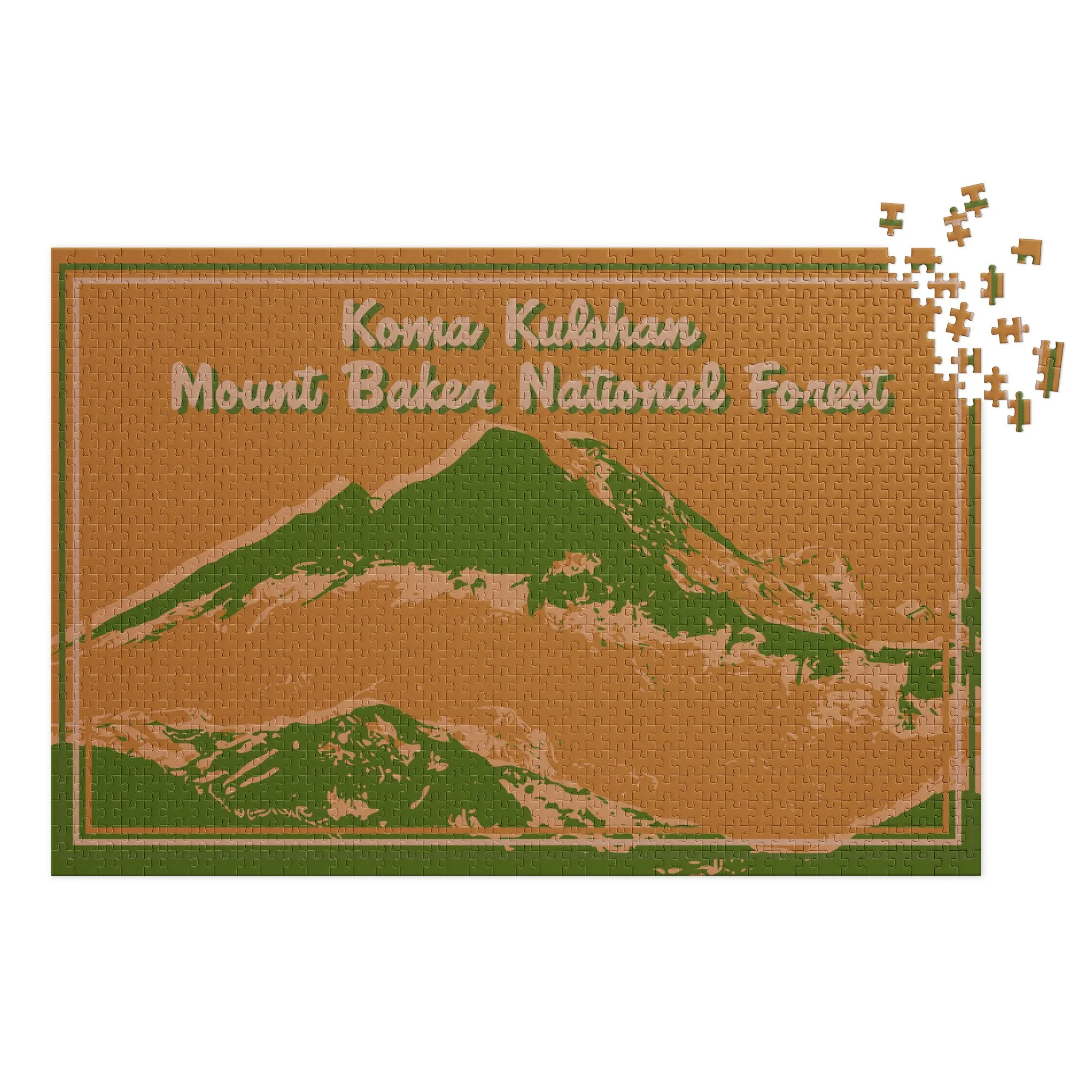 Koma Kulshan (Mount Baker) puzzle in a three-color block print style!